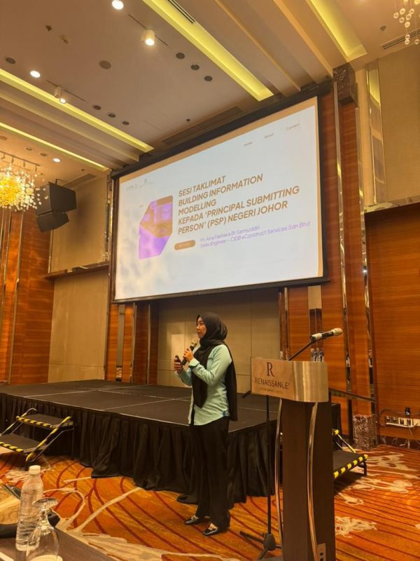 Puan Azra wakil dari CIDB E-Construct Services Sdn Bhd memberi taklimat produk Building Infirmation Modelling (BIM) kepada kalangan peserta terdiri dari Principal Submitting Person (PSP).