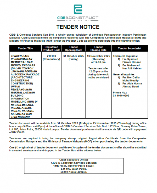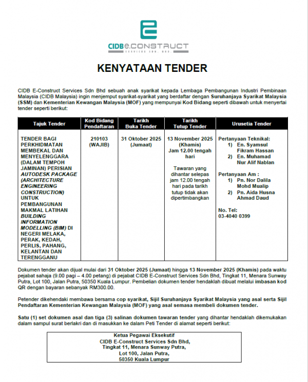 TENDER BAGI PERKHIDMATAN MEMBEKAL DAN MENYELENGGARA (DALAM TEMPOH JAMINAN) PERISIAN AUTODESK PACKAGE (ARCHITECTURE ENGINEERING CONSTRUCTION COLLECTION) UNTUK PEMBANGUNAN MAKMAL LATIHAN BUILDING INFORMATION MODELLING (BIM) DI NEGERI MELAKA, PERAK, KEDAH, PERLIS, PAHANG, KELANTAN DAN TERENGGANU